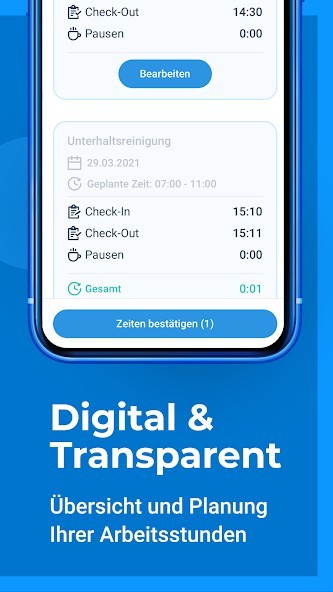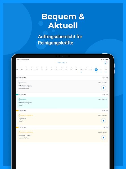 An interactive daily planner informs and reminds the employee about his daily tasks and takes short-term changes into account. The cleaner is guided through his working day and assigned areas and tasks are only shown to him. The current cleaning status is shown in real time to the supervisor and, if required, to the commercial client.