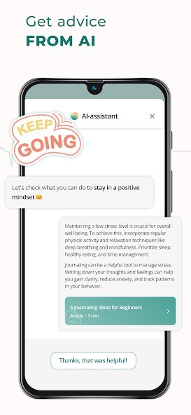 Also, you can recognize depression or burnout with a thought diary and mood tracker right in the app.