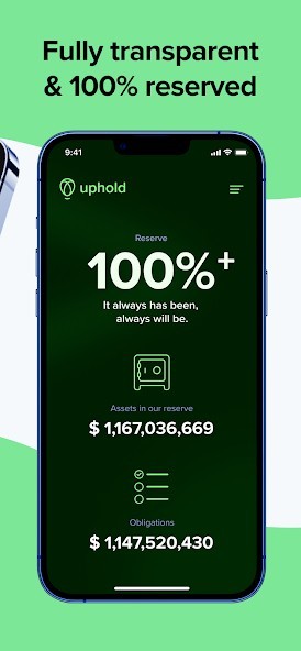 Uphold is the only digital assets platform to publish assets and liabilities in real-time online. Your money stays where it should be, in your wallet! We’re always 100%+ reserved so your funds are available to withdraw any time you want.